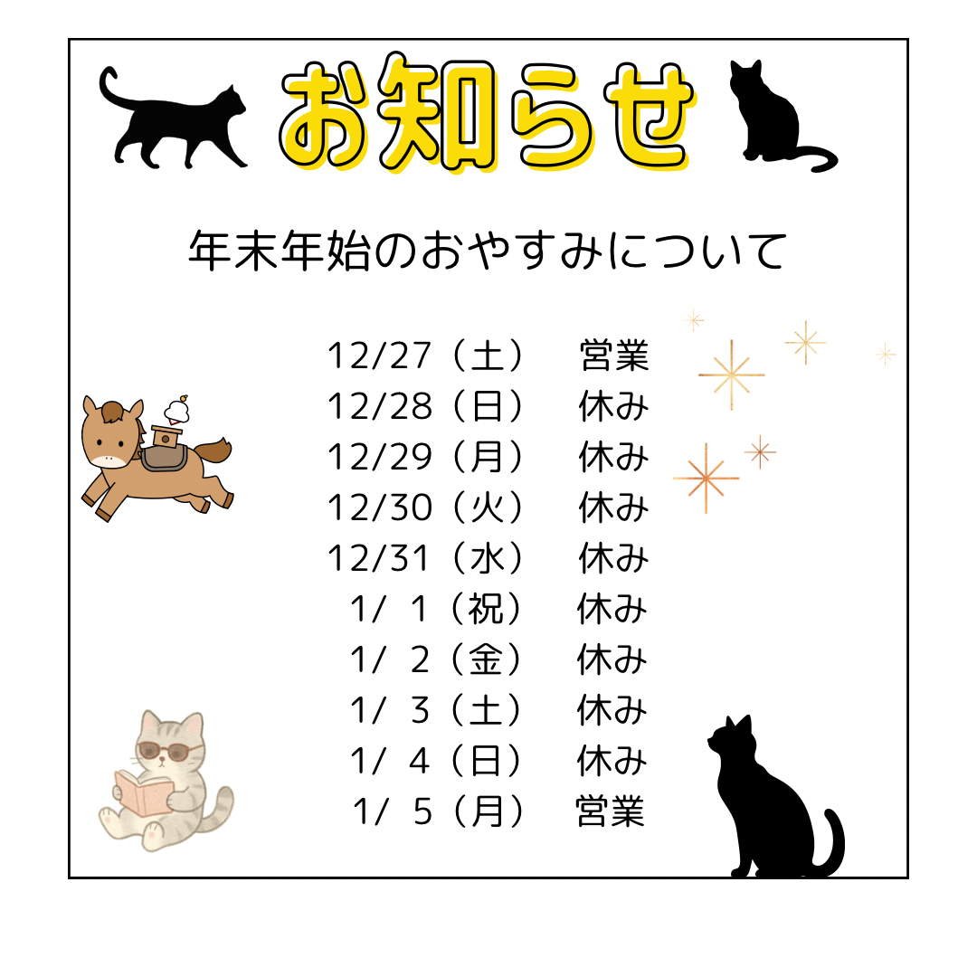 お休み中はお電話やメッセージ等の対応も難しい為、ご用事のある方は1月5日の営業再開後にご連絡いただけますと幸いです。